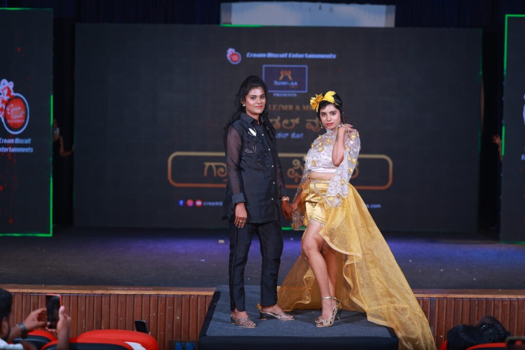 Participated in Little/Mr & Miss Sandalwood Grand finale conducted by cream biscuit entertainments. Fashion designer Mrs. Pushpa standing beside a model wearing her modern Indian gold and white runway design.